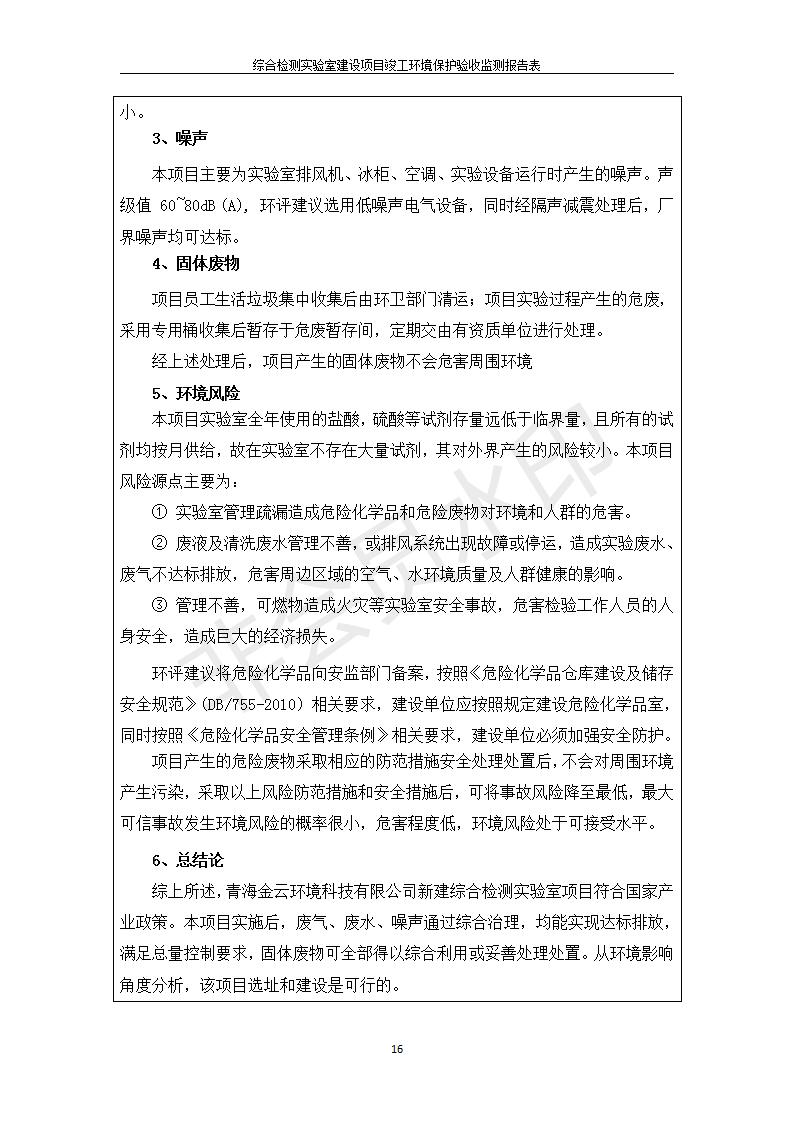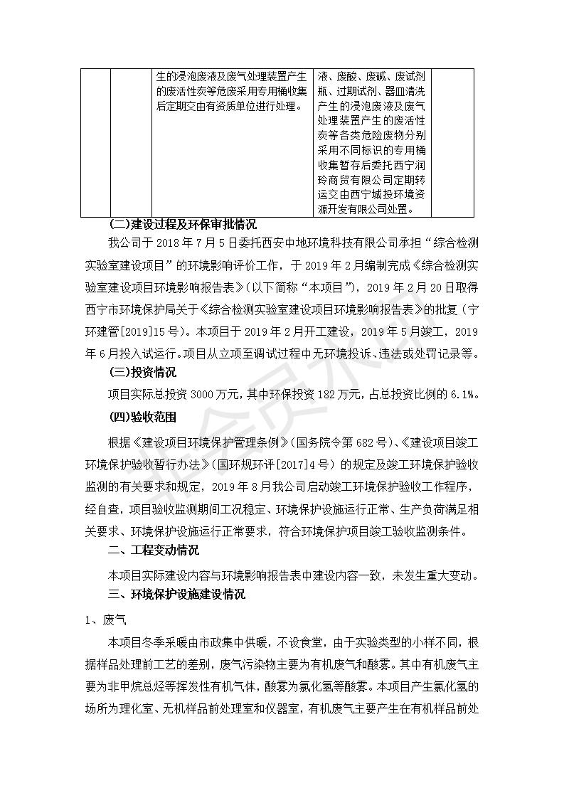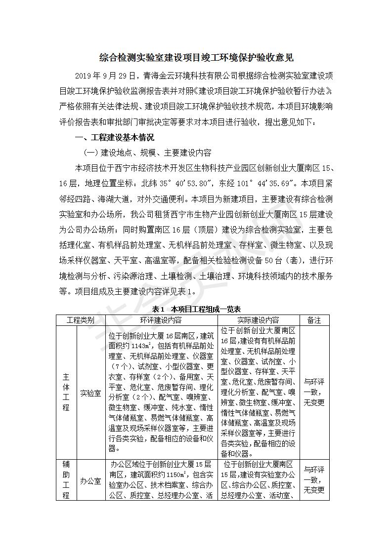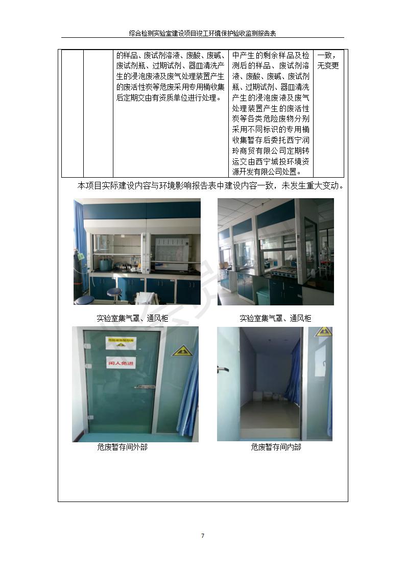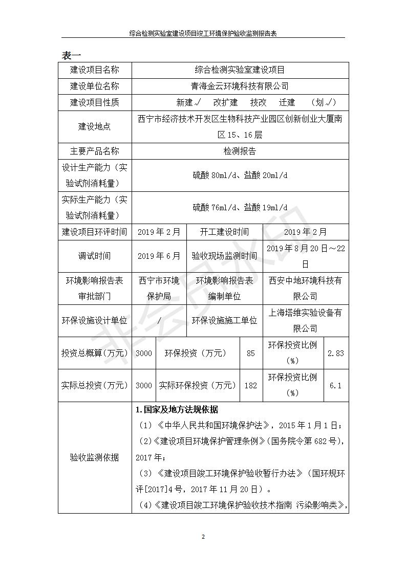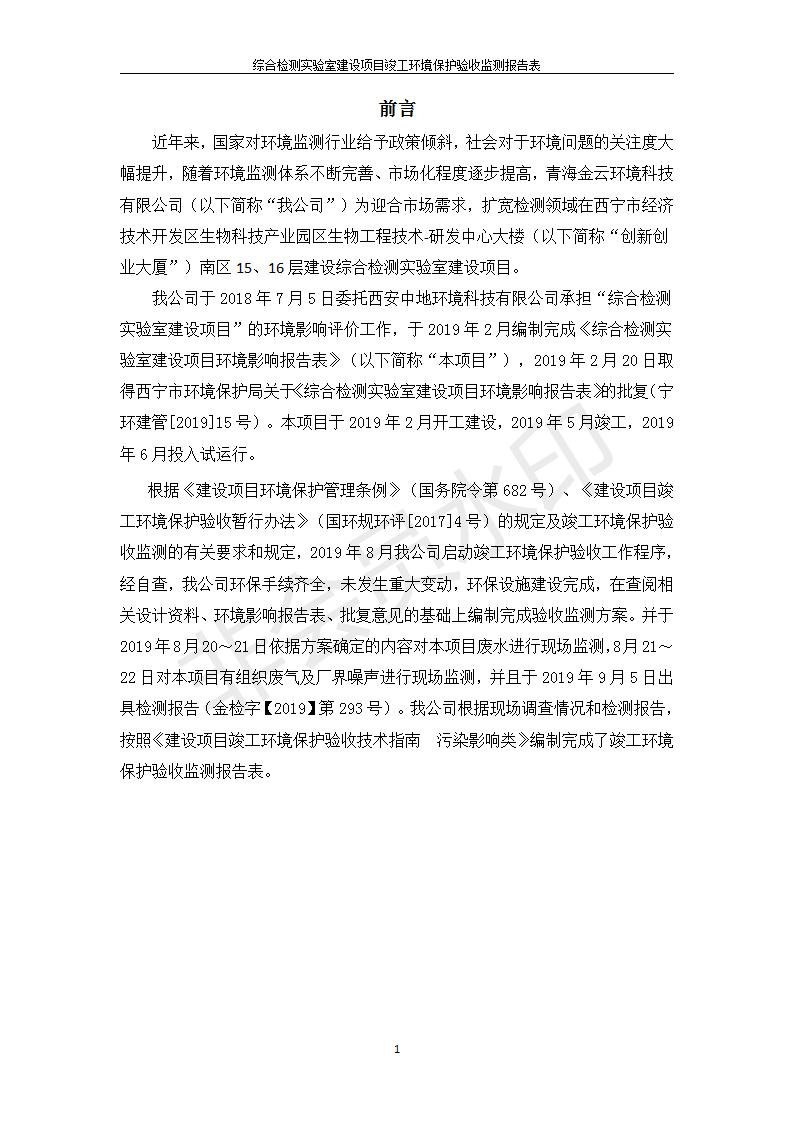 根據(jù)中華人民共和國國務(wù)院令第682號《國務(wù)院關(guān)于修改〈建設(shè)項(xiàng)目環(huán)境保護(hù)管理?xiàng)l例〉的決定》和《建設(shè)項(xiàng)目竣工環(huán)境保護(hù)驗(yàn)收暫行辦法》(國務(wù)院令682號),綜合檢測實(shí)驗(yàn)室建設(shè)項(xiàng)目(包括竣工環(huán)境保護(hù)驗(yàn)收監(jiān)測報告表和驗(yàn)收意見)公示如下。 一、項(xiàng)目名稱:綜合檢測實(shí)驗(yàn)室建設(shè)項(xiàng)目 二、地點(diǎn):西寧市經(jīng)濟(jì)技術(shù)開發(fā)區(qū)生物科技產(chǎn)業(yè)園區(qū)創(chuàng)新創(chuàng)業(yè)大廈南區(qū)15、16層 六、聯(lián)系電話:0971-6515411 七、公示時間:二〇一九年十一月十九日至二〇一九年十二月十六日 公示期間,對上述公示內(nèi)容如有異議,請以書面形式反饋,個人須署真實(shí)姓名,單位須加蓋公章。