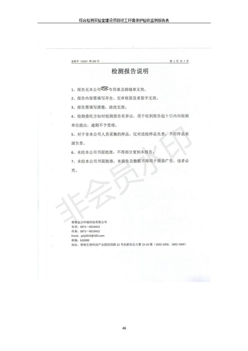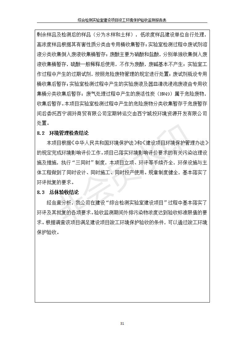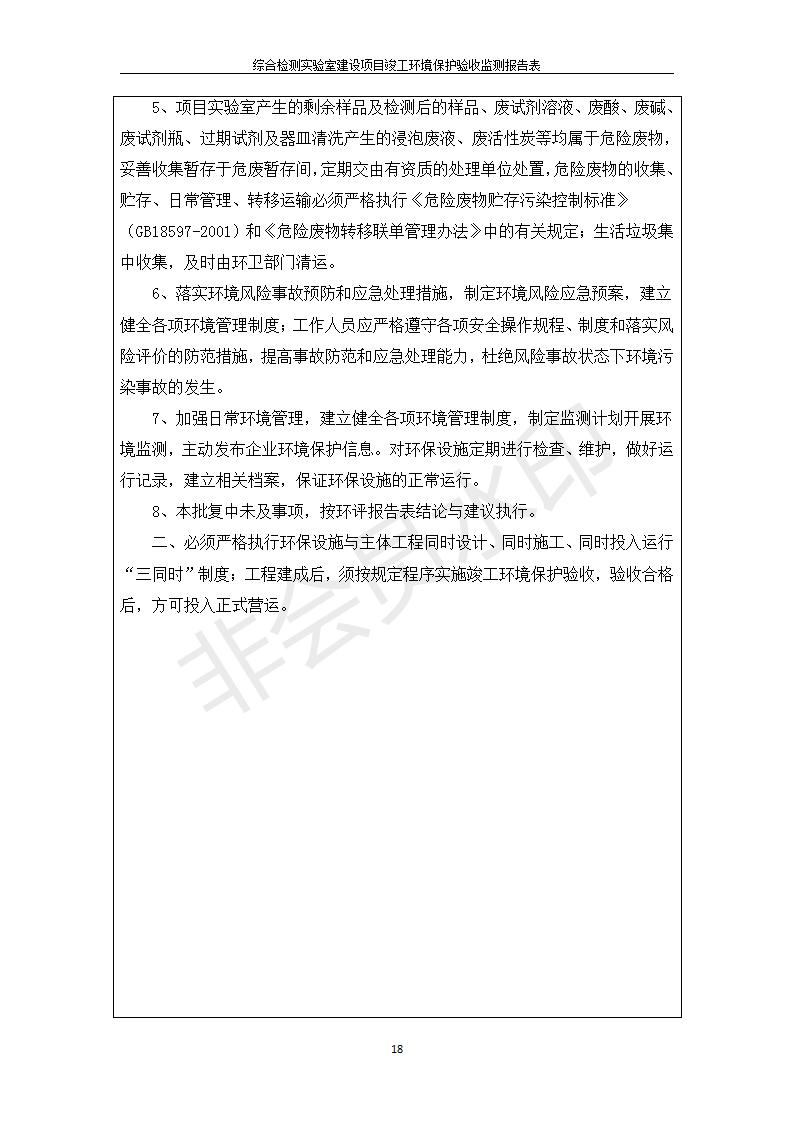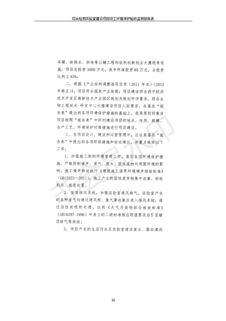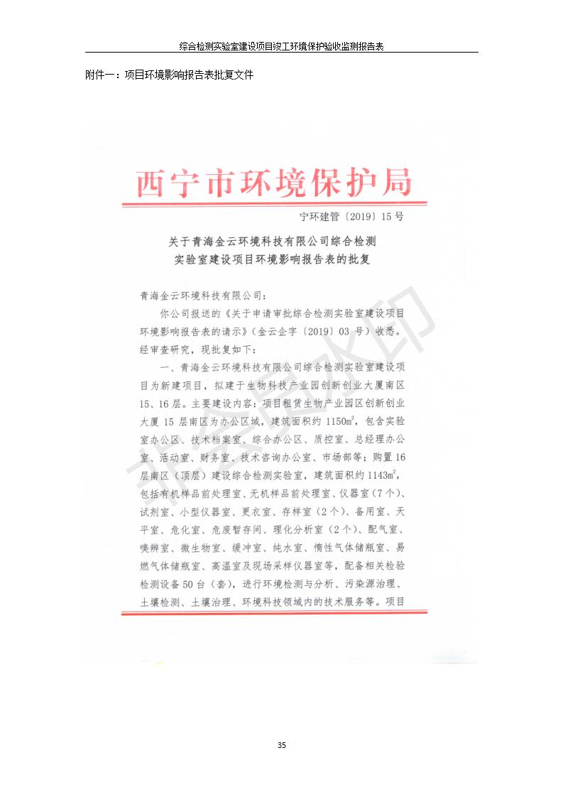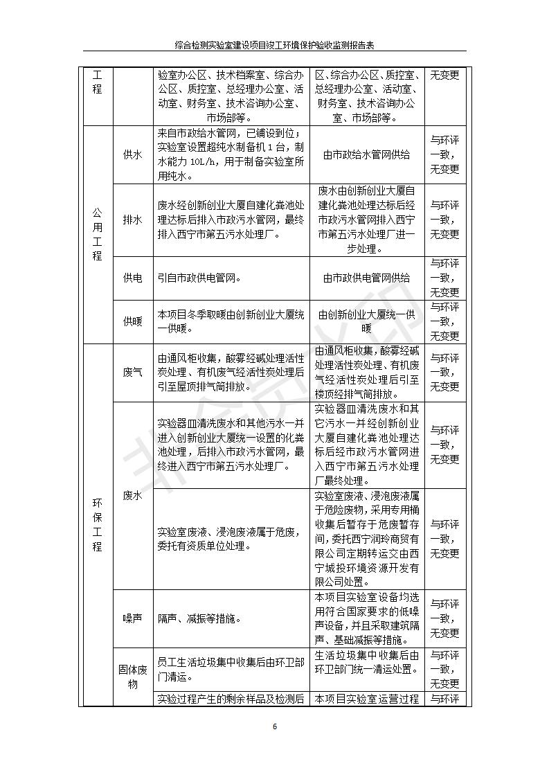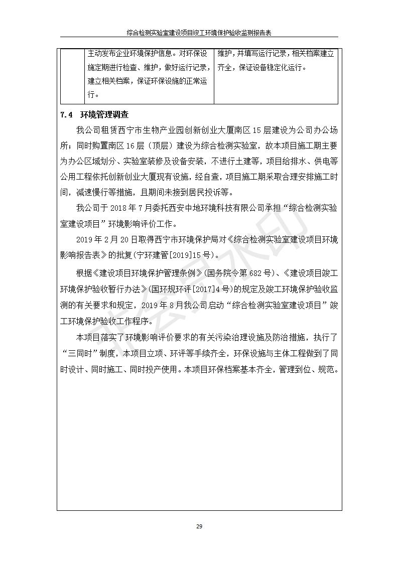 根據(jù)中華人民共和國國務(wù)院令第682號《國務(wù)院關(guān)于修改〈建設(shè)項(xiàng)目環(huán)境保護(hù)管理?xiàng)l例〉的決定》和《建設(shè)項(xiàng)目竣工環(huán)境保護(hù)驗(yàn)收暫行辦法》(國務(wù)院令682號),綜合檢測實(shí)驗(yàn)室建設(shè)項(xiàng)目(包括竣工環(huán)境保護(hù)驗(yàn)收監(jiān)測報告表和驗(yàn)收意見)公示如下。 一、項(xiàng)目名稱:綜合檢測實(shí)驗(yàn)室建設(shè)項(xiàng)目 二、地點(diǎn):西寧市經(jīng)濟(jì)技術(shù)開發(fā)區(qū)生物科技產(chǎn)業(yè)園區(qū)創(chuàng)新創(chuàng)業(yè)大廈南區(qū)15、16層 六、聯(lián)系電話:0971-6515411 七、公示時間:二〇一九年十一月十九日至二〇一九年十二月十六日 公示期間,對上述公示內(nèi)容如有異議,請以書面形式反饋,個人須署真實(shí)姓名,單位須加蓋公章。