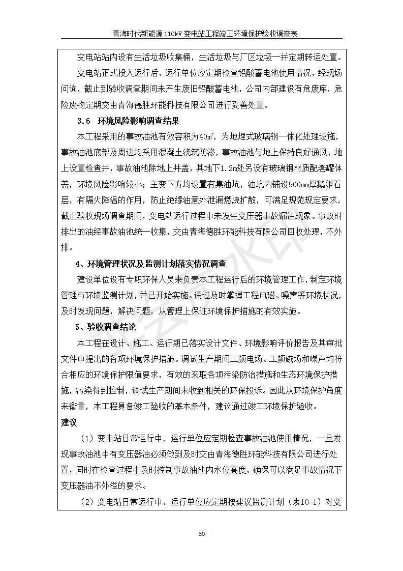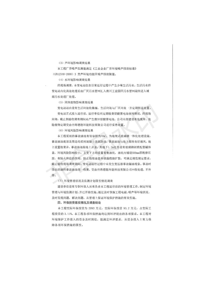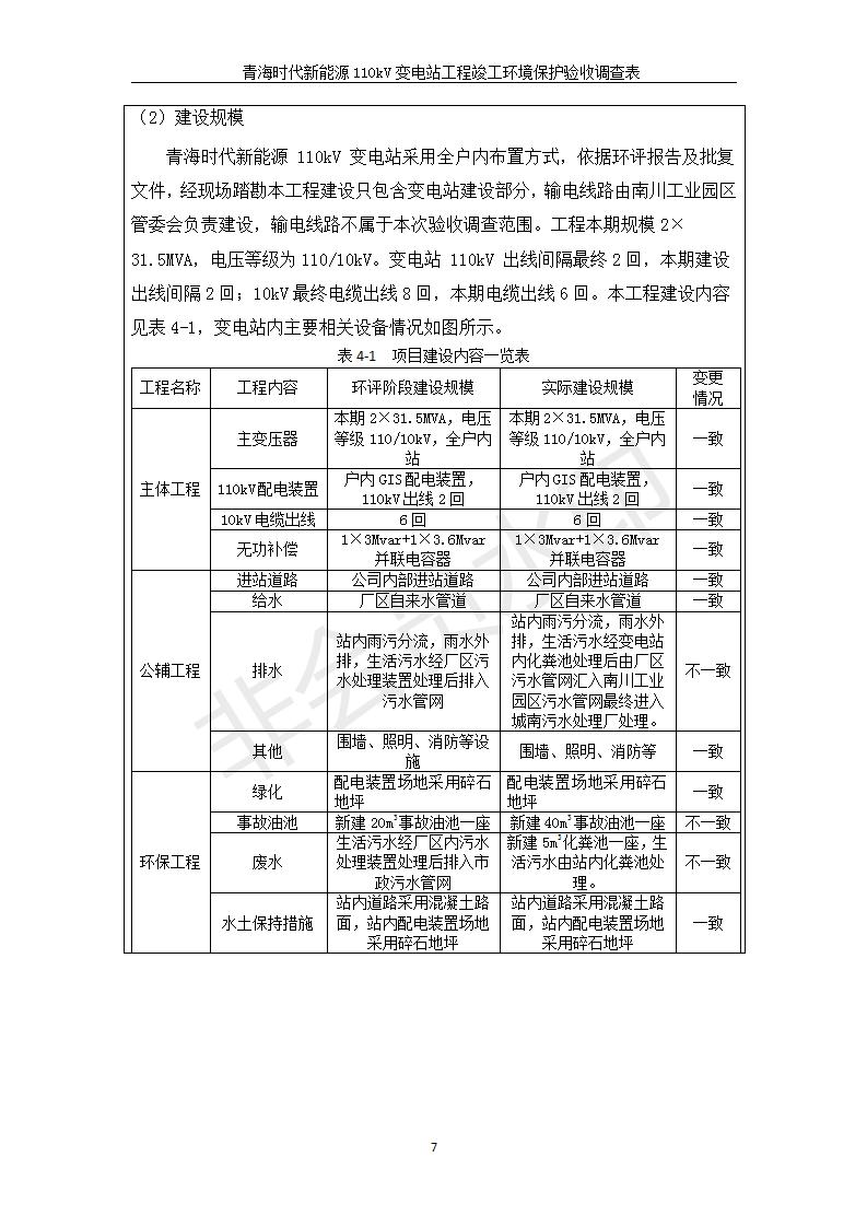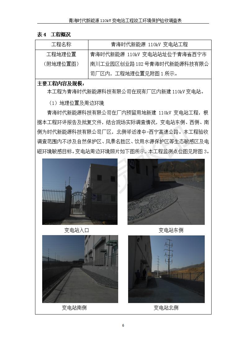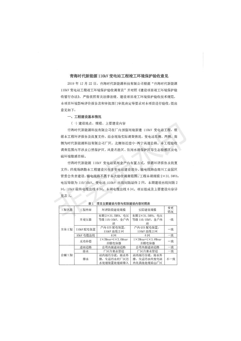 根據(jù)中華人民共和國國務(wù)院令第682號(hào)《國務(wù)院關(guān)于修改〈建設(shè)項(xiàng)目環(huán)境保護(hù)管理?xiàng)l例〉的決定》和《建設(shè)項(xiàng)目竣工環(huán)境保護(hù)驗(yàn)收暫行辦法》(國務(wù)院令682號(hào)),青海時(shí)代新能源110kV變電站工程(包括竣工環(huán)境保護(hù)驗(yàn)收調(diào)查表和驗(yàn)收意見)公示如下。 一、項(xiàng)目名稱:青海時(shí)代新能源110kV變電站工程 二、地點(diǎn):青海省西寧市南川工業(yè)園區(qū)創(chuàng)業(yè)路182號(hào)青海時(shí)代新能源科技有限公司廠區(qū)內(nèi) 三、建設(shè)單位:青海時(shí)代新能源科技有限公司 四、建設(shè)內(nèi)容:青海時(shí)代新能源 110kV 變電站采用全戶內(nèi)布置方式,依據(jù)環(huán)評(píng)報(bào)告及批復(fù)文件,經(jīng)現(xiàn)場踏勘本工程建設(shè)只包含變電站建設(shè)部分,輸電線路由南川工業(yè)園區(qū)管委會(huì)負(fù)責(zé)建設(shè),輸電線路不屬于本次驗(yàn)收調(diào)查范圍。工程本期規(guī)模2×31.5MVA,電壓等級(jí)為110/10kV。變電站 110kV 出線間隔最終2回,本期建設(shè)出線間隔2回;10kV最終電纜出線8回,本期電纜出線6回。 五、聯(lián)系人:張工 六、聯(lián)系電話:0971-6515411 七、公示時(shí)間:二〇二〇年一月十四日至二〇二〇年二月十三日 公示期間,對(duì)上述公示內(nèi)容如有異議,請(qǐng)以書面形式反饋,個(gè)人須署真實(shí)姓名,單位須加蓋公章。