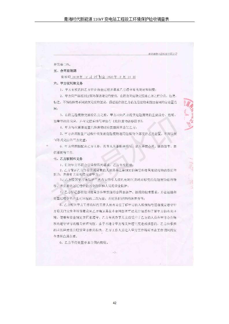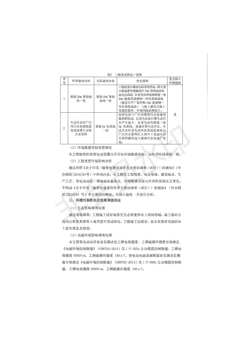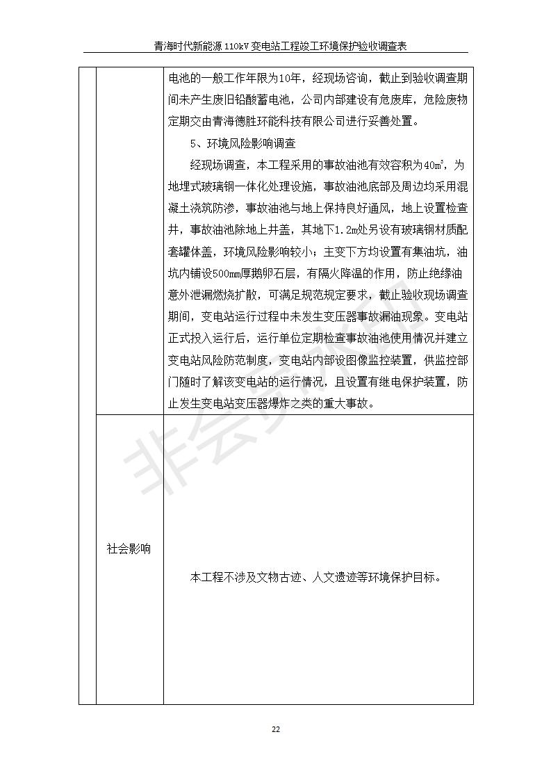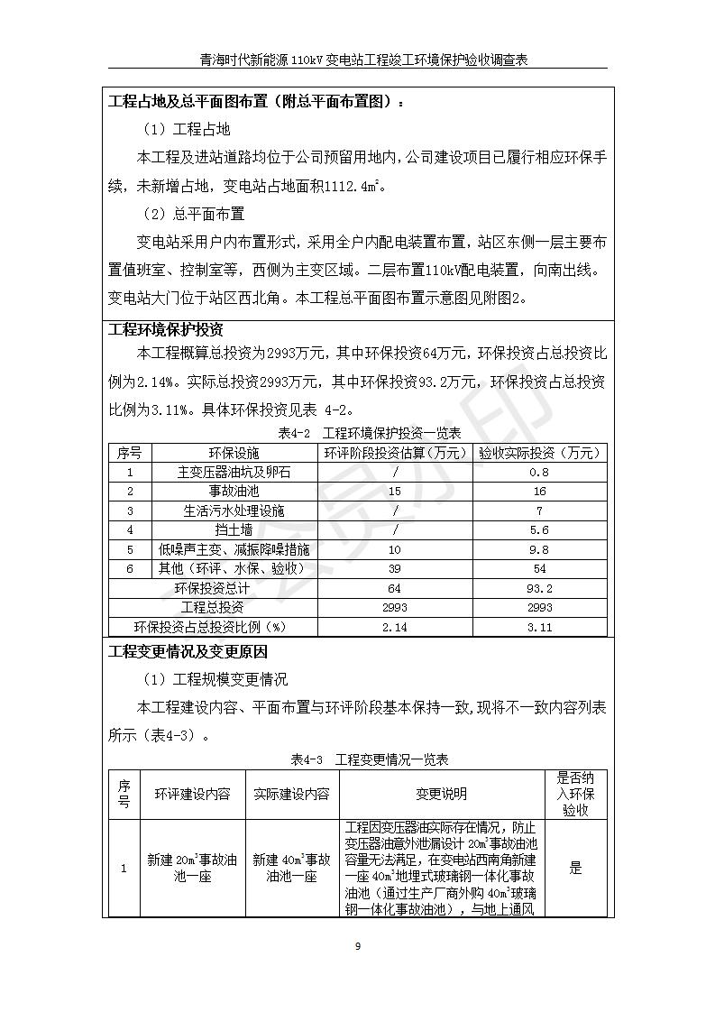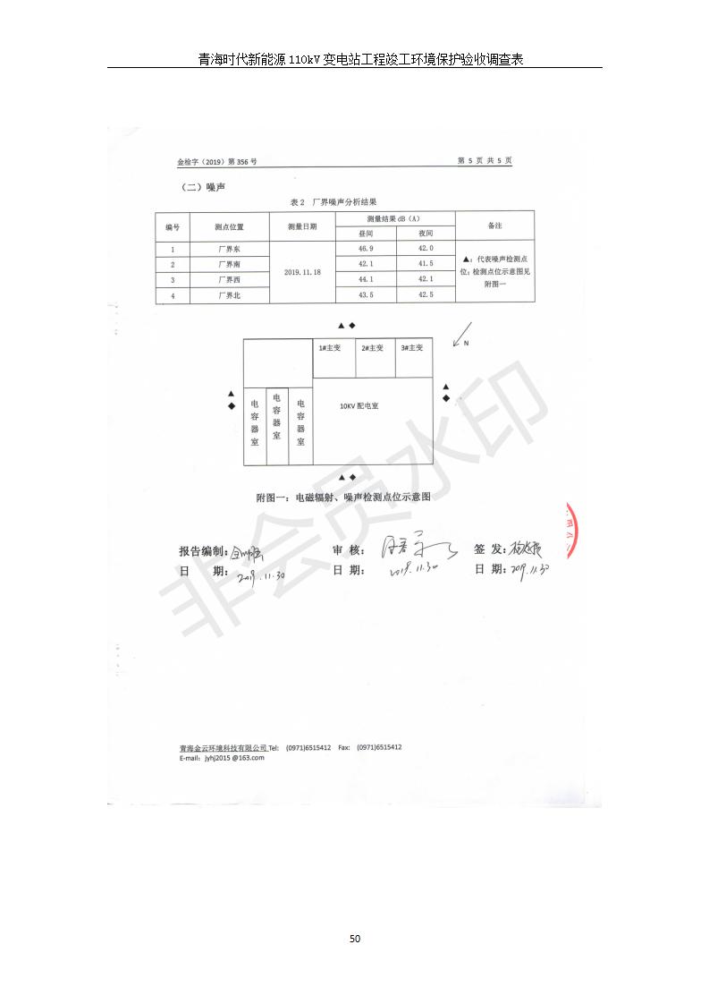 根據(jù)中華人民共和國國務(wù)院令第682號(hào)《國務(wù)院關(guān)于修改〈建設(shè)項(xiàng)目環(huán)境保護(hù)管理?xiàng)l例〉的決定》和《建設(shè)項(xiàng)目竣工環(huán)境保護(hù)驗(yàn)收暫行辦法》(國務(wù)院令682號(hào)),青海時(shí)代新能源110kV變電站工程(包括竣工環(huán)境保護(hù)驗(yàn)收調(diào)查表和驗(yàn)收意見)公示如下。 一、項(xiàng)目名稱:青海時(shí)代新能源110kV變電站工程 二、地點(diǎn):青海省西寧市南川工業(yè)園區(qū)創(chuàng)業(yè)路182號(hào)青海時(shí)代新能源科技有限公司廠區(qū)內(nèi) 三、建設(shè)單位:青海時(shí)代新能源科技有限公司 四、建設(shè)內(nèi)容:青海時(shí)代新能源 110kV 變電站采用全戶內(nèi)布置方式,依據(jù)環(huán)評(píng)報(bào)告及批復(fù)文件,經(jīng)現(xiàn)場踏勘本工程建設(shè)只包含變電站建設(shè)部分,輸電線路由南川工業(yè)園區(qū)管委會(huì)負(fù)責(zé)建設(shè),輸電線路不屬于本次驗(yàn)收調(diào)查范圍。工程本期規(guī)模2×31.5MVA,電壓等級(jí)為110/10kV。變電站 110kV 出線間隔最終2回,本期建設(shè)出線間隔2回;10kV最終電纜出線8回,本期電纜出線6回。 五、聯(lián)系人:張工 六、聯(lián)系電話:0971-6515411 七、公示時(shí)間:二〇二〇年一月十四日至二〇二〇年二月十三日 公示期間,對(duì)上述公示內(nèi)容如有異議,請(qǐng)以書面形式反饋,個(gè)人須署真實(shí)姓名,單位須加蓋公章。