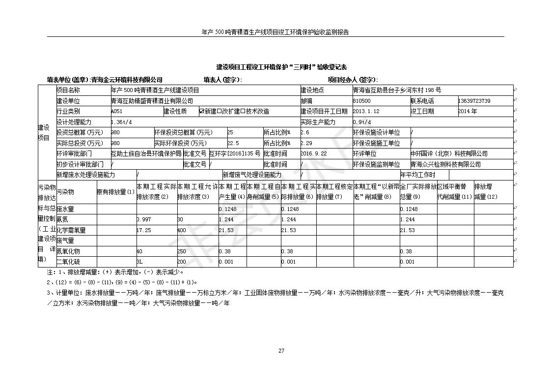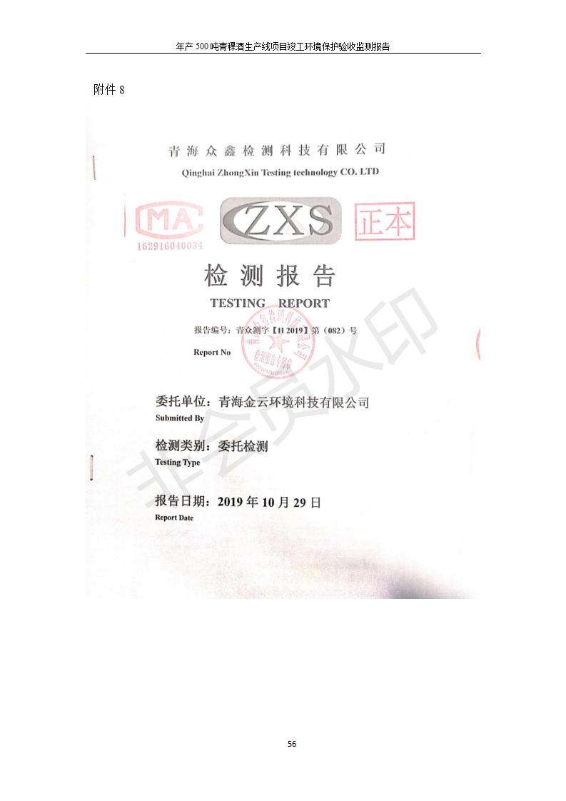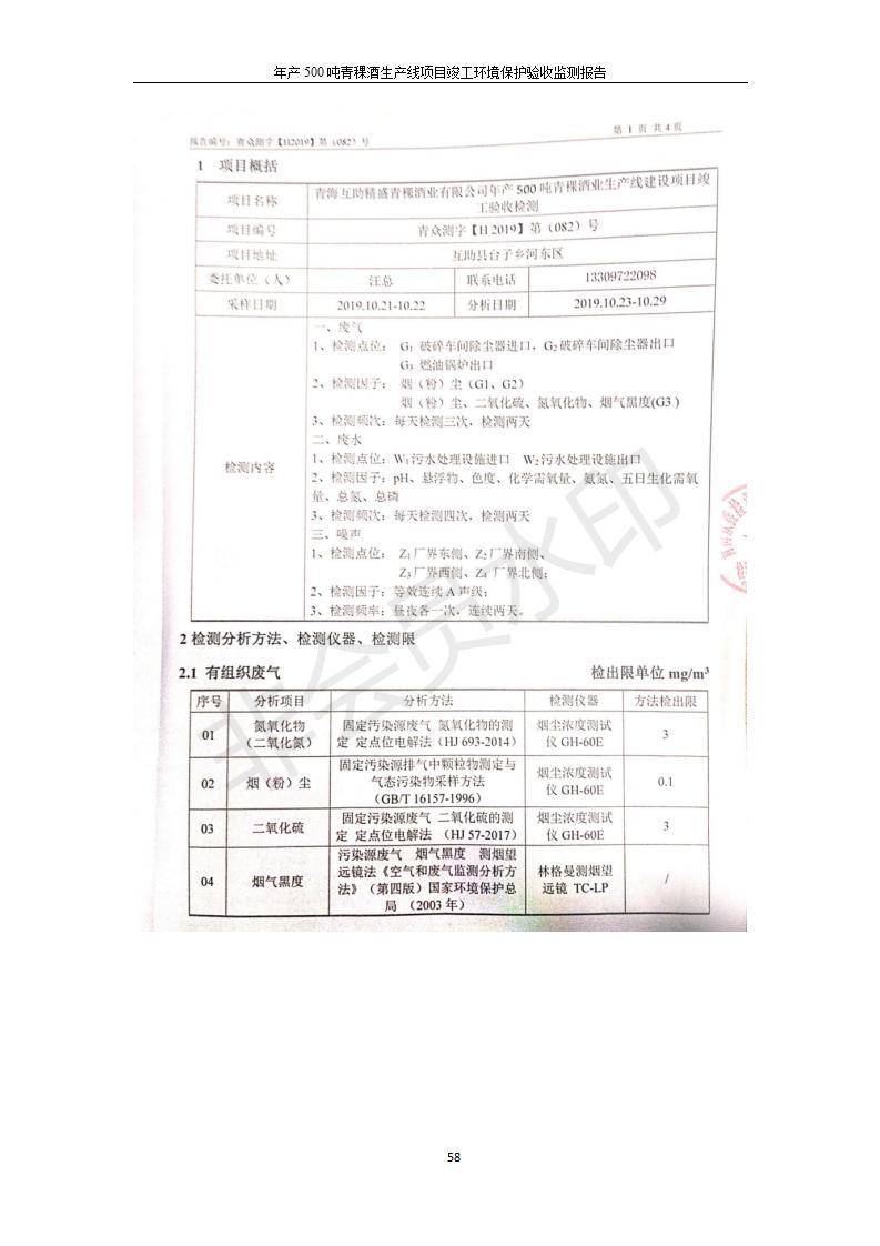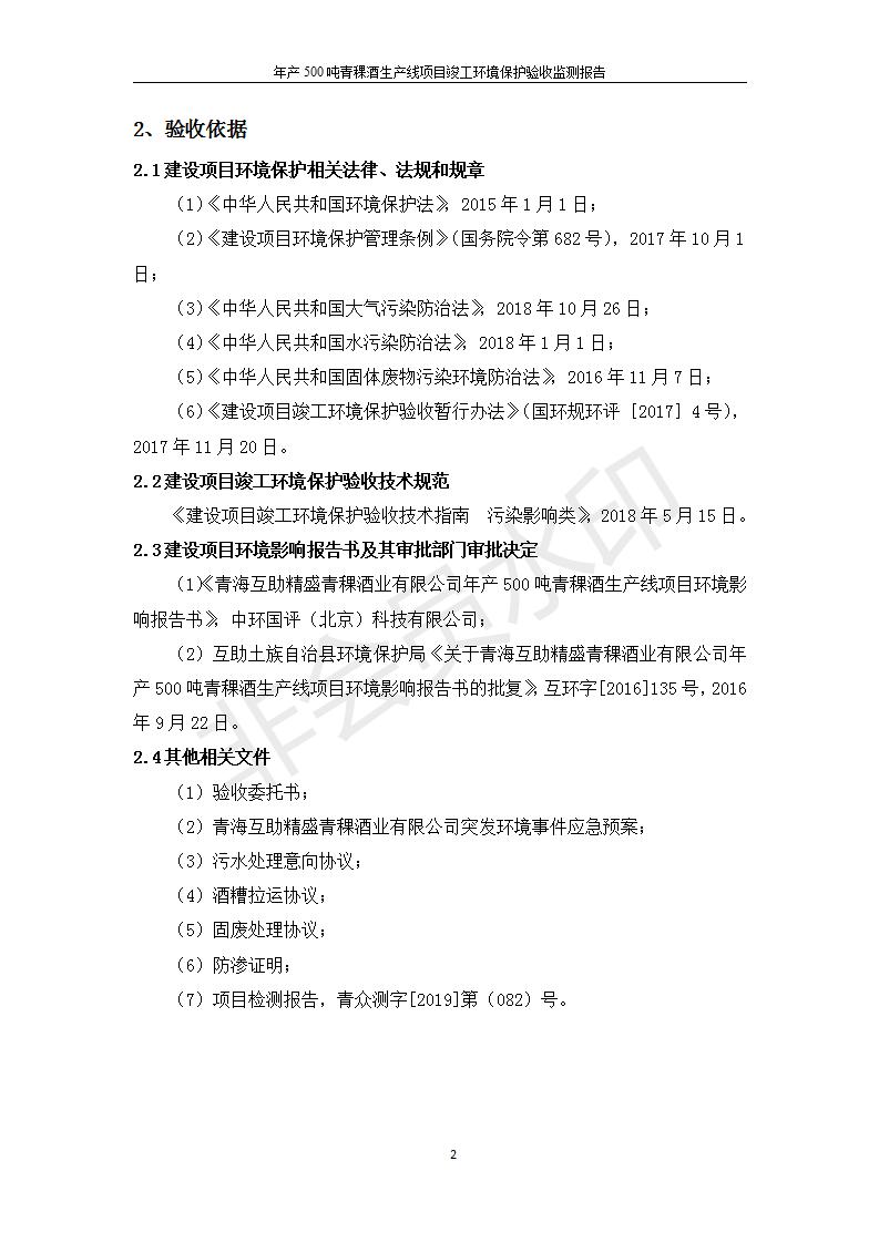 根據(jù)中華人民共和國國務(wù)院令第682號《國務(wù)院關(guān)于修改〈建設(shè)項(xiàng)目環(huán)境保護(hù)管理?xiàng)l例〉的決定》和《建設(shè)項(xiàng)目竣工環(huán)境保護(hù)驗(yàn)收暫行辦法》(國務(wù)院令682號),綜合檢測實(shí)驗(yàn)室建設(shè)項(xiàng)目(包括竣工環(huán)境保護(hù)驗(yàn)收監(jiān)測報告表和驗(yàn)收意見)公示如下。 一、項(xiàng)目名稱:青;ブ⑶囡茦I(yè)有限公司年產(chǎn)500噸青稞酒業(yè)生產(chǎn)線建設(shè)項(xiàng)目 二、地點(diǎn):青海省海東市互助土族自治縣臺子鄉(xiāng)河?xùn)|村198號